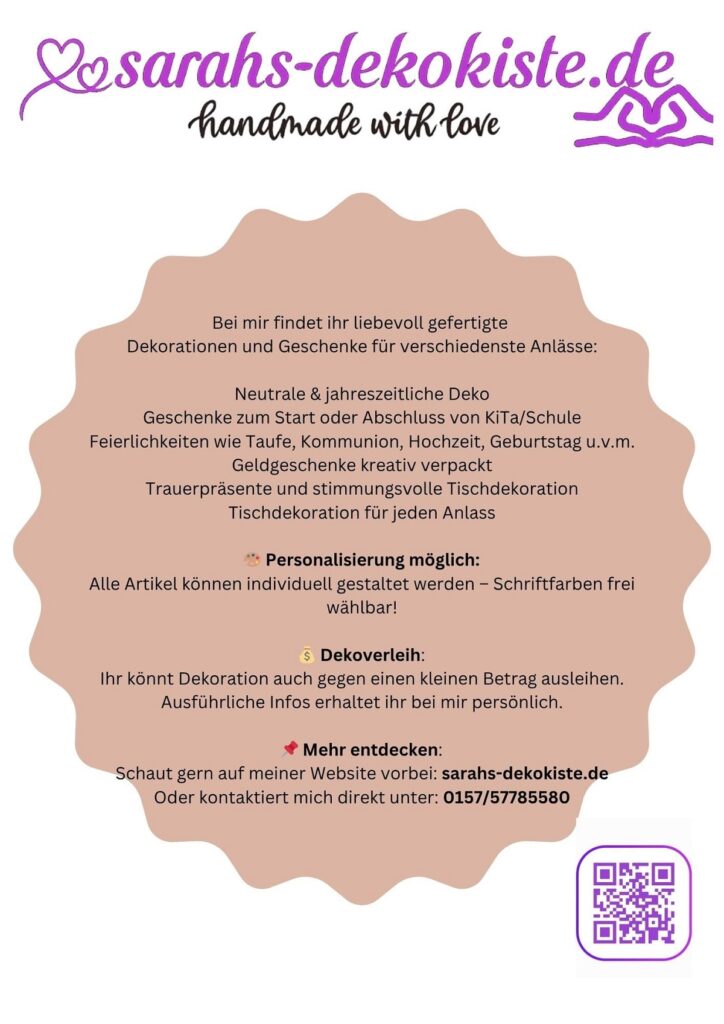 Ich fertige jahresbezogene, neutrale oder auch Deko zu bestimmten Anlässen, wie z.B. Muttertag, Geburtstag oder auch als kleines Dankeschön an.